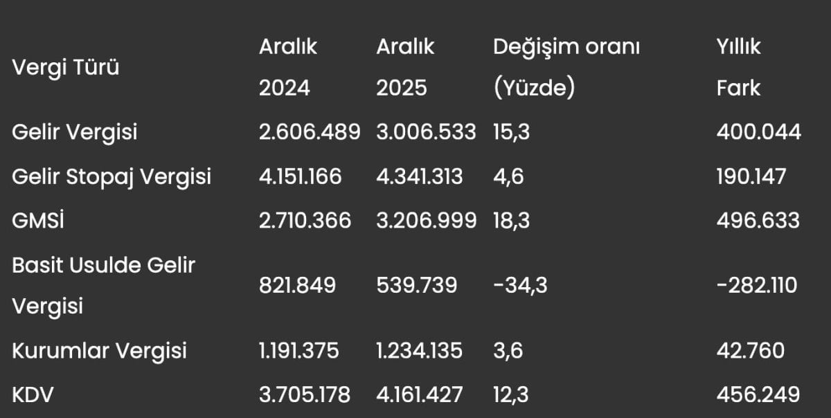 2025 Aralık ayı itibarıyla gelir vergisi mükellefi sayısı, bir önceki yılın aynı dönemine göre 400 bin 44 artarak 3 milyon 6 bin 533’e yükseldi. Bu artış oranı %15,3 oldu.